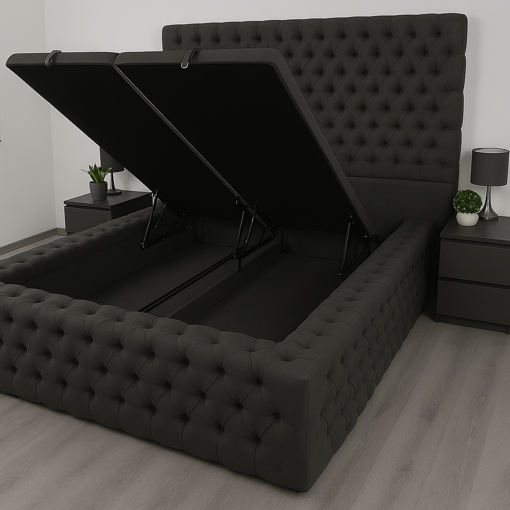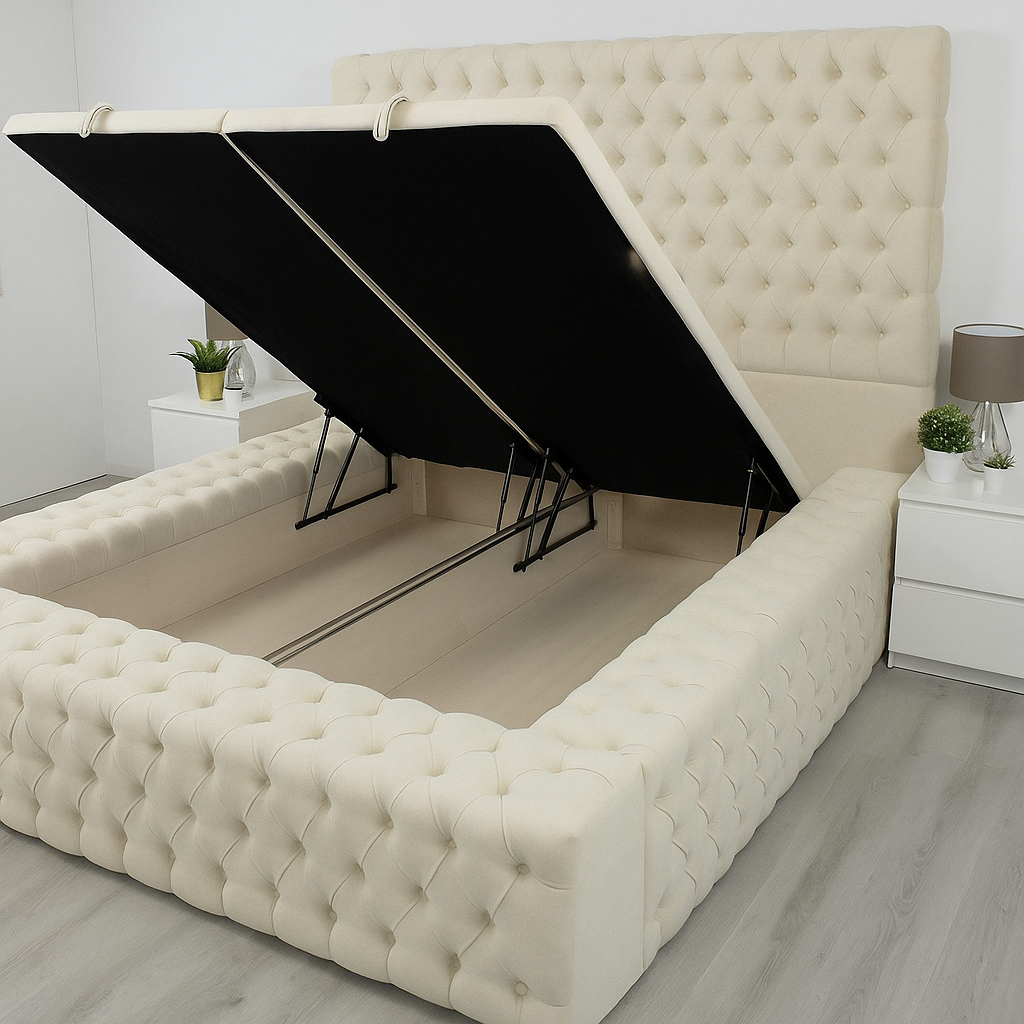 Transform your bedroom with the Grand Ambassador Divan Platform Bed, a perfect blend of style, comfort, and practicality. Expertly crafted in the UK, this luxurious bed frame features a sturdy platform base for superior support and an elegant upholstered finish that elevates any interior. This is a divan ottoman solid wood storage base split into two pieces.