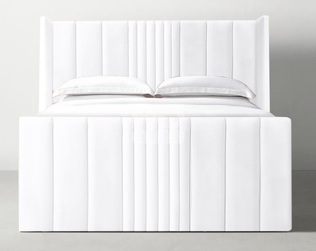 Contemporary lined wing back bed frame in a range of fabrics and colours with matching lined foot board. Optional storage. Modern panel design